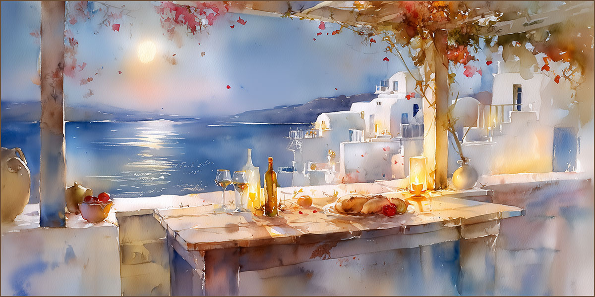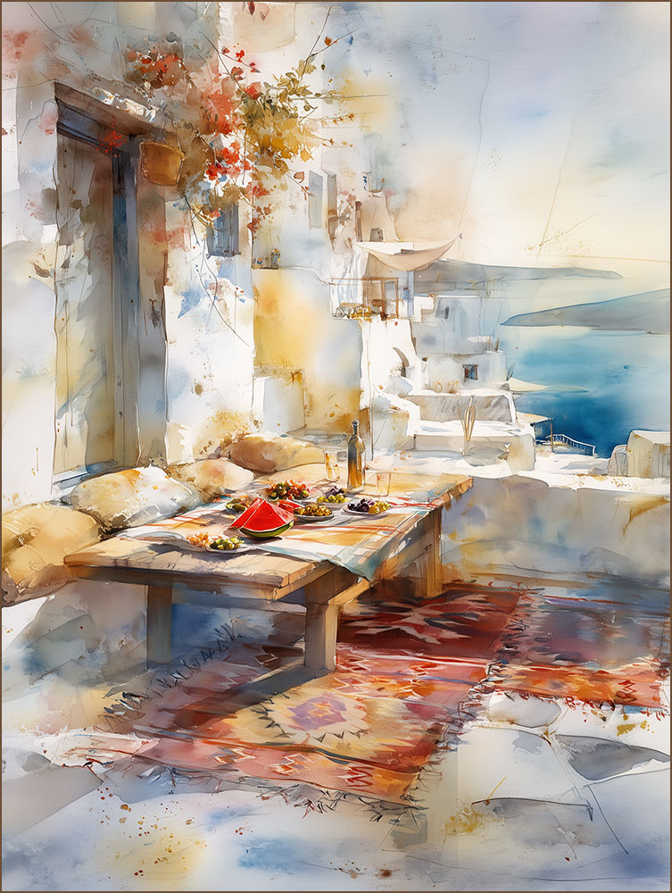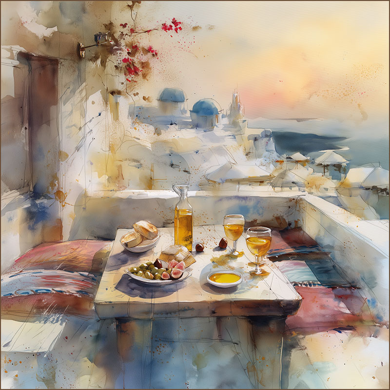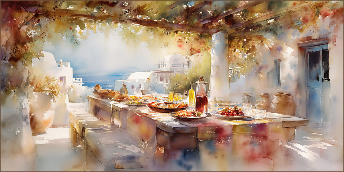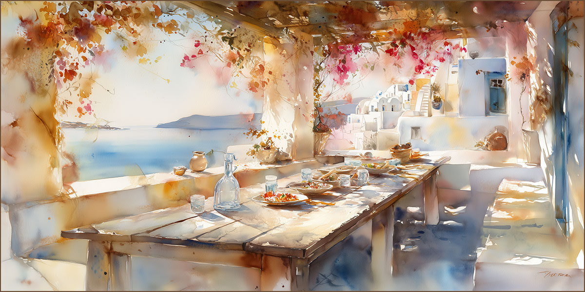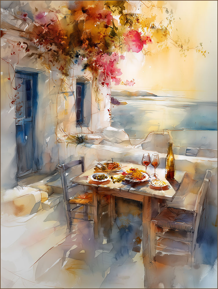 In Aegean Table Under Bougainvillea, the day begins in warmth and laughter — plates filled with color, wine shining in the sun.