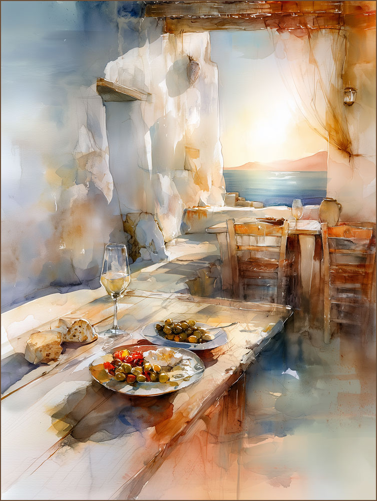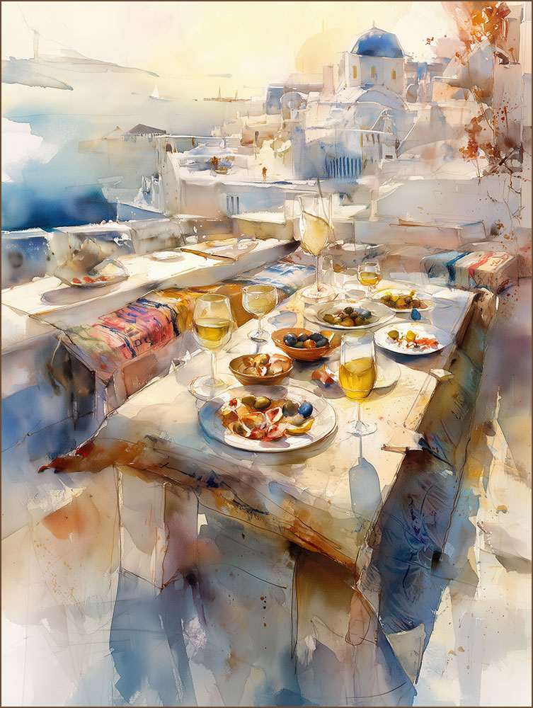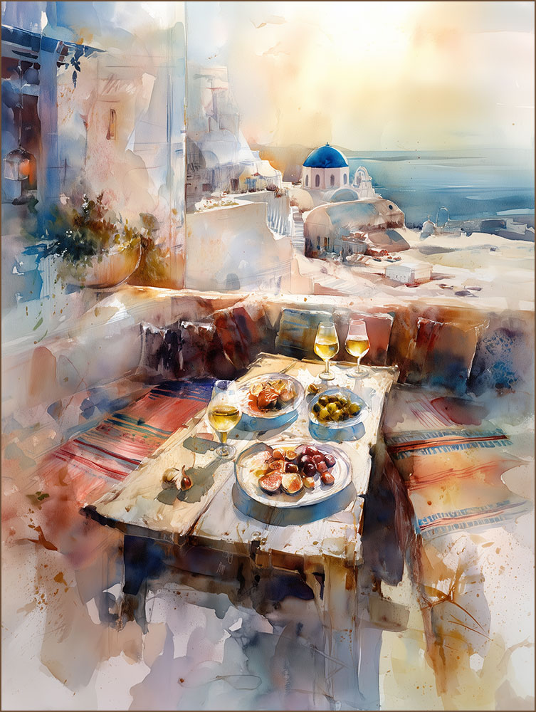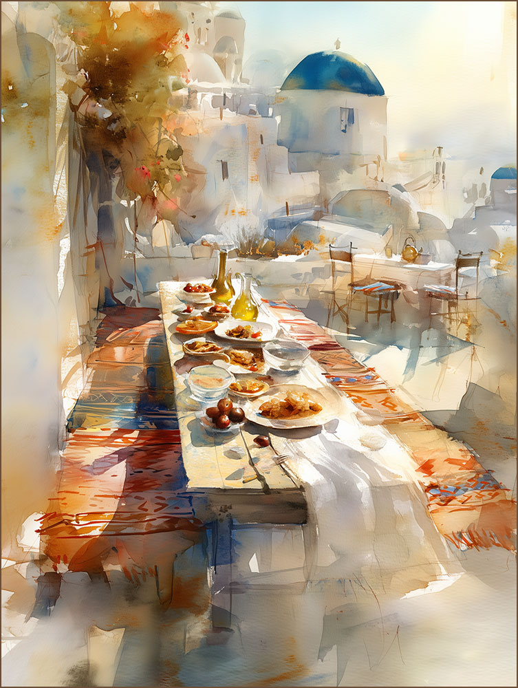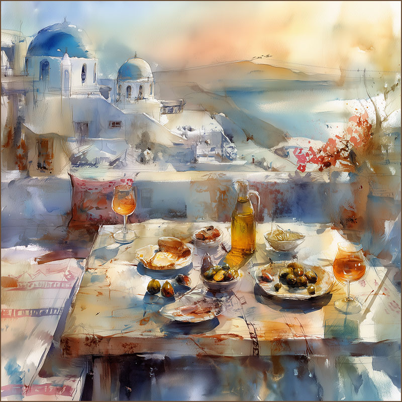 In Aegean Table Under Bougainvillea, the day begins in warmth and laughter — plates filled with color, wine shining in the sun.